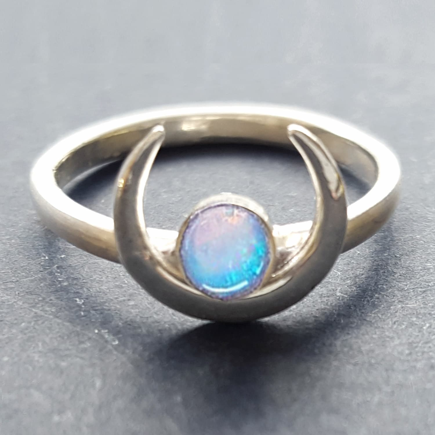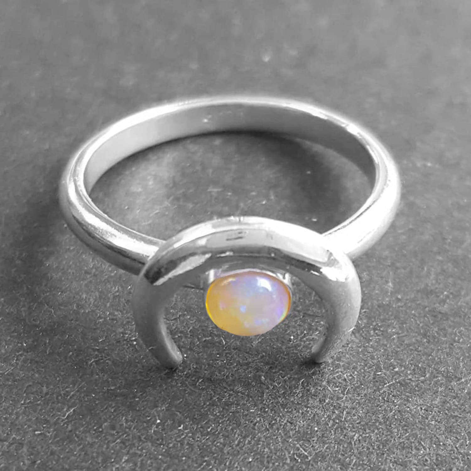 The Opal Moon Ring features a delicate crescent moon design from our handcrafted celestial jewellery range. Made from solid sterling silver, this ring showcases a genuine Opal gemstone, primarily sourced from Australia with occasional Ethiopian opals chosen for their distinctive colours. These opals typically display a translucent white base with captivating blue and green opalescence, and some reveal striking orange fire flashes. Available in multiple sizes, the Opal Crescent Moon ring comes presented in a gift box. A coordinating Opal Moon Necklace is also offered separately.