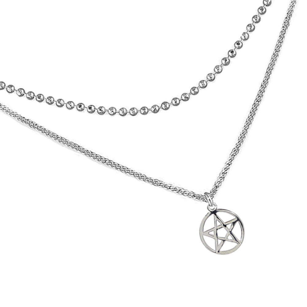 This Pentagram Choker Necklace showcases a sterling silver double chain, featuring a shorter 14-inch chain embellished with finely faceted beads that catch and reflect light for a shimmering effect. A small pentagram charm hangs from the longer 16-inch chain. This gorgeous choker appears larger in images than it does when worn, making it an understated yet striking necklace.